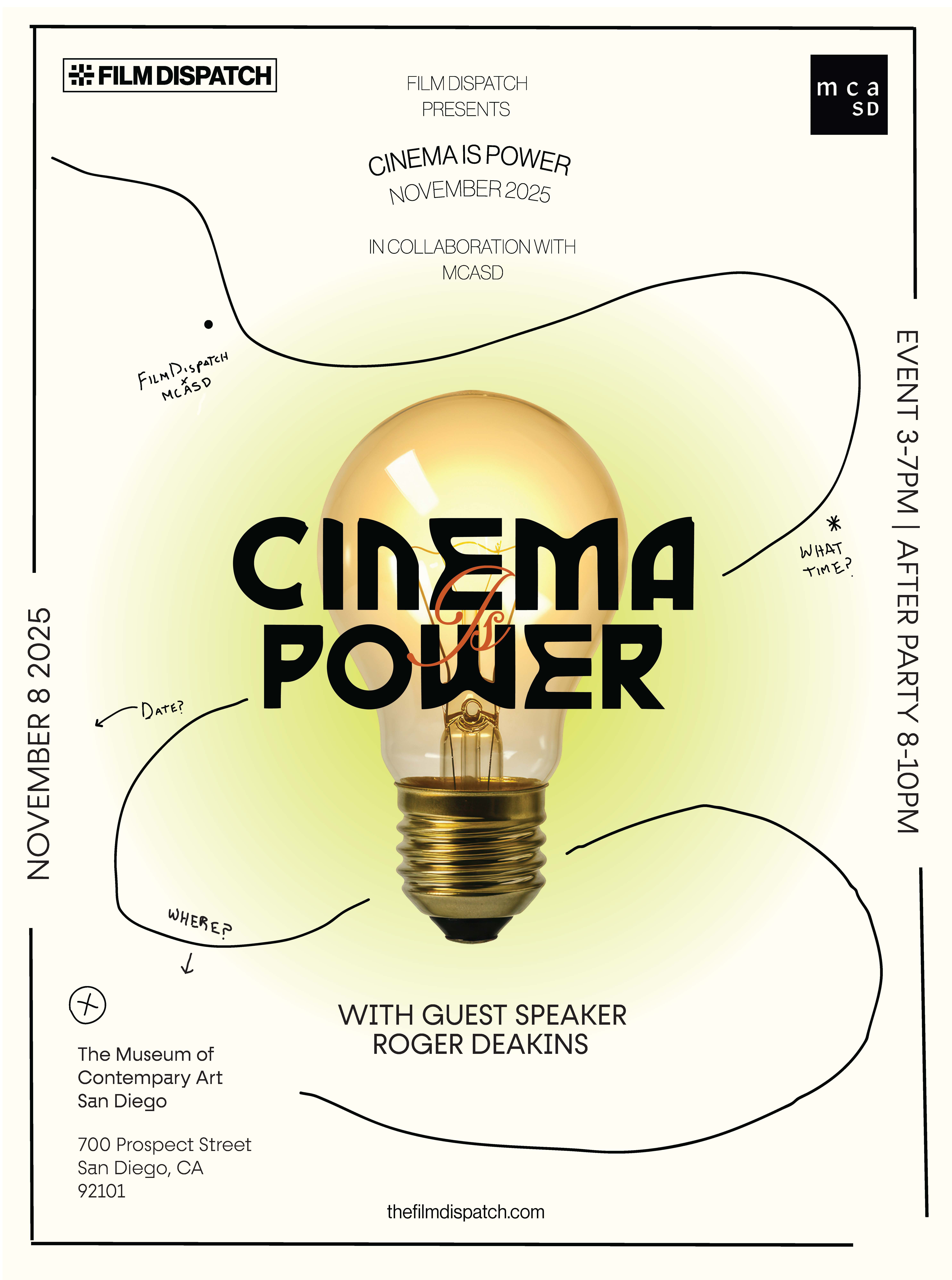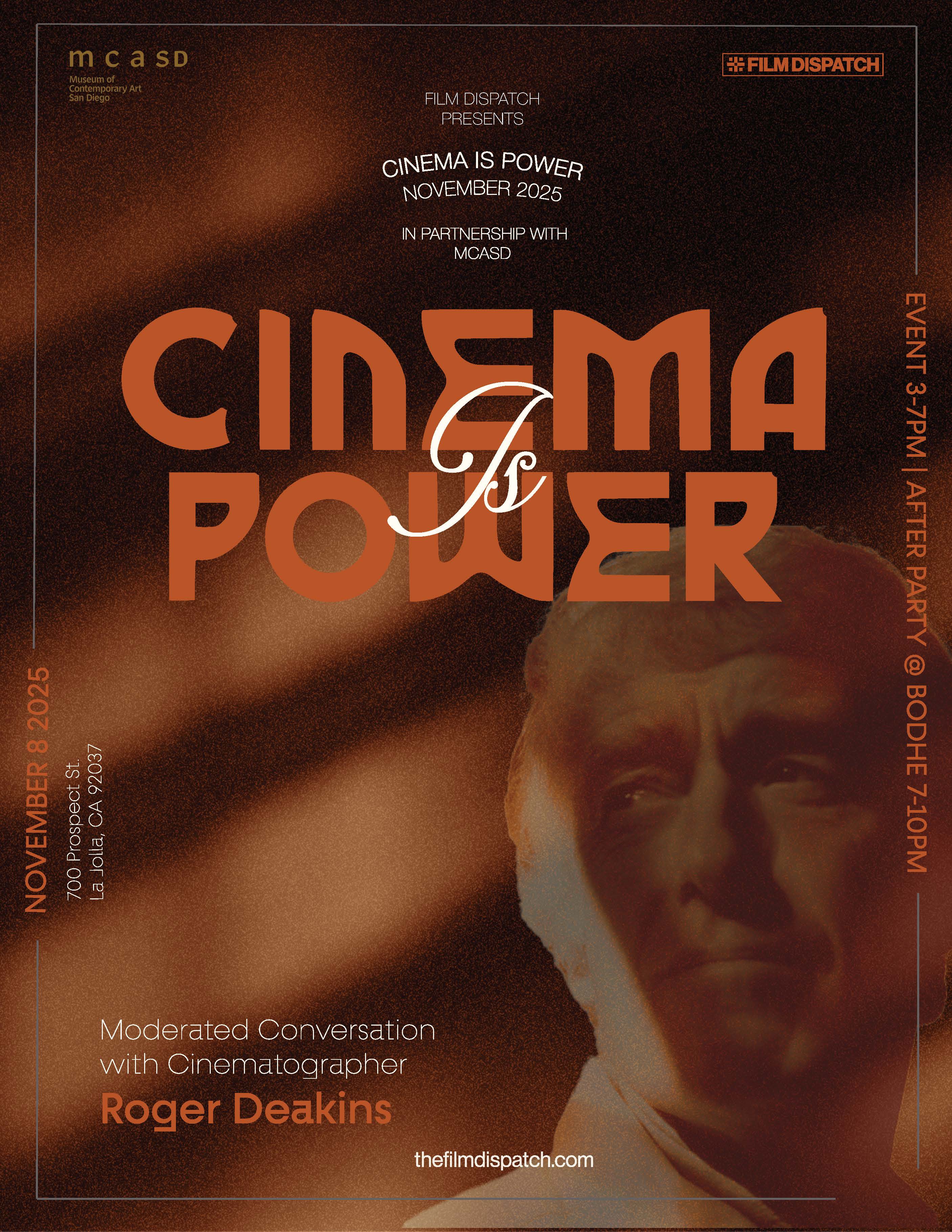 Cinema Is Power is an event identity created for Film Dispatch x Museum of Contemporary Art San Diego; an evening centered on the art of light, storytelling, and community in cinema. Designed around a live conversation with legendary cinematographer Roger Deakins, the identity needed to feel cinematic, intentional, and resonate with Deakins artisitic language.